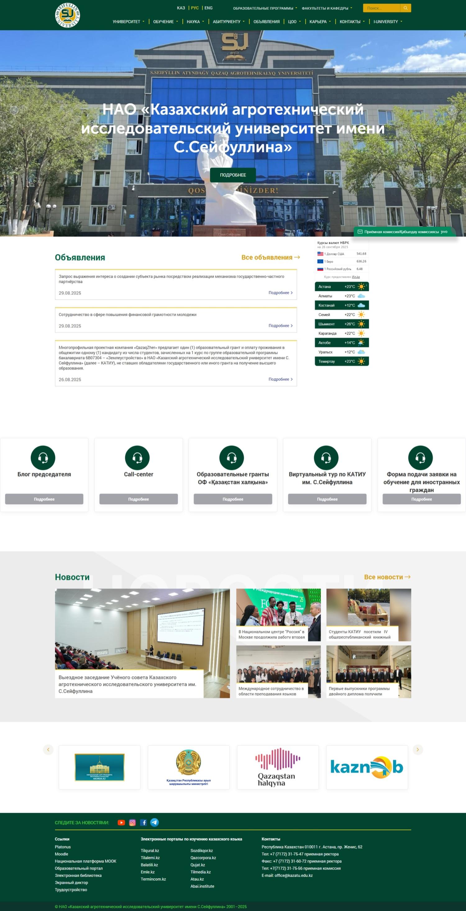 Казахский агротехнический университет имени Сакена Сейфуллина — один из ведущих аграрных вузов Казахстана с богатой историей и современным подходом к обучению. Университет готовит квалифицированных специалистов для сельского хозяйства, экологии, инженерии, IT и других востребованных сфер. Главный приоритет в работе — сочетание фундаментального образования с практическими навыками и научными исследованиями.